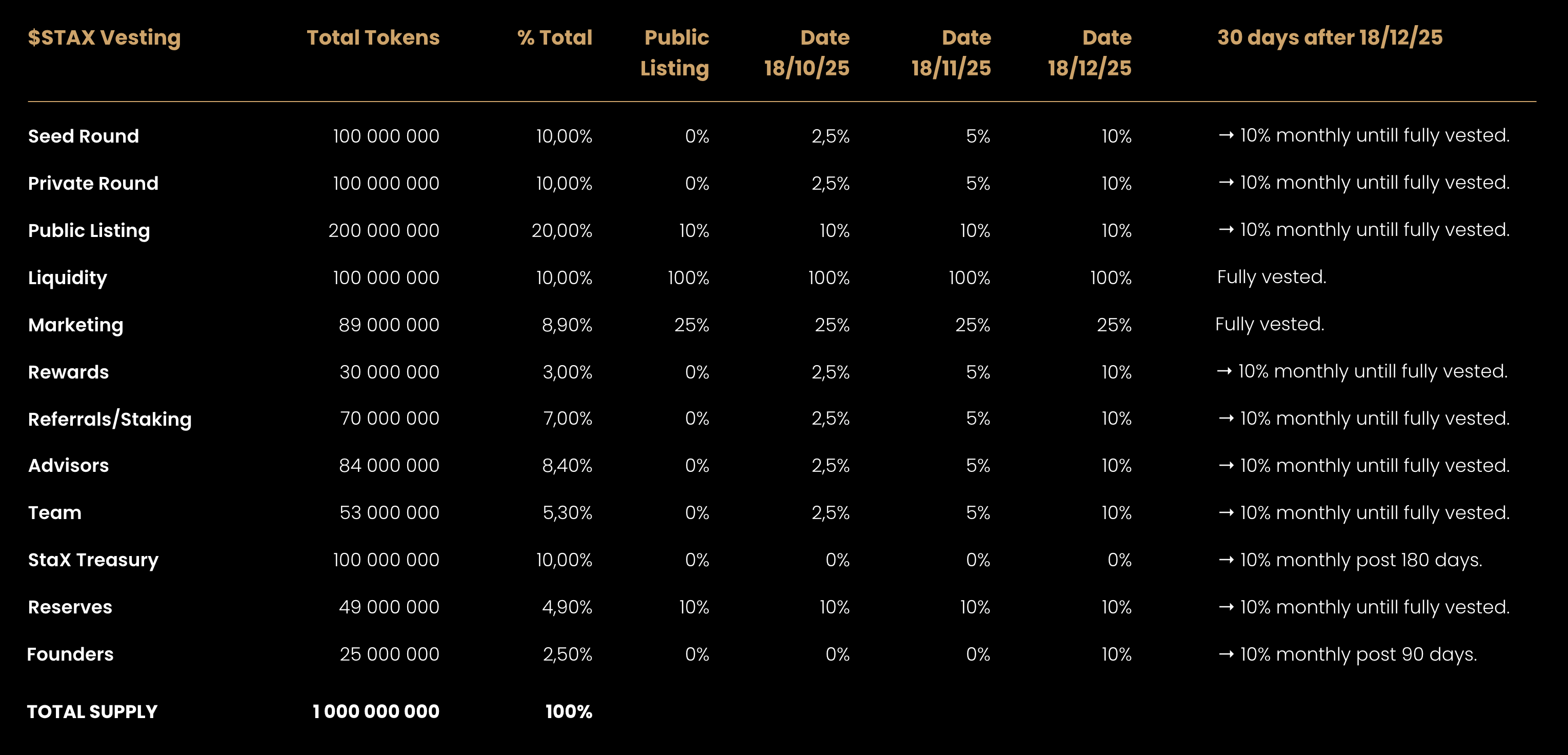 The following outlines the vesting structure for each allocation group. Vesting schedules begin from the official Listing Date — the day $STAX tokens are first made publicly tradable on centralized exchanges.